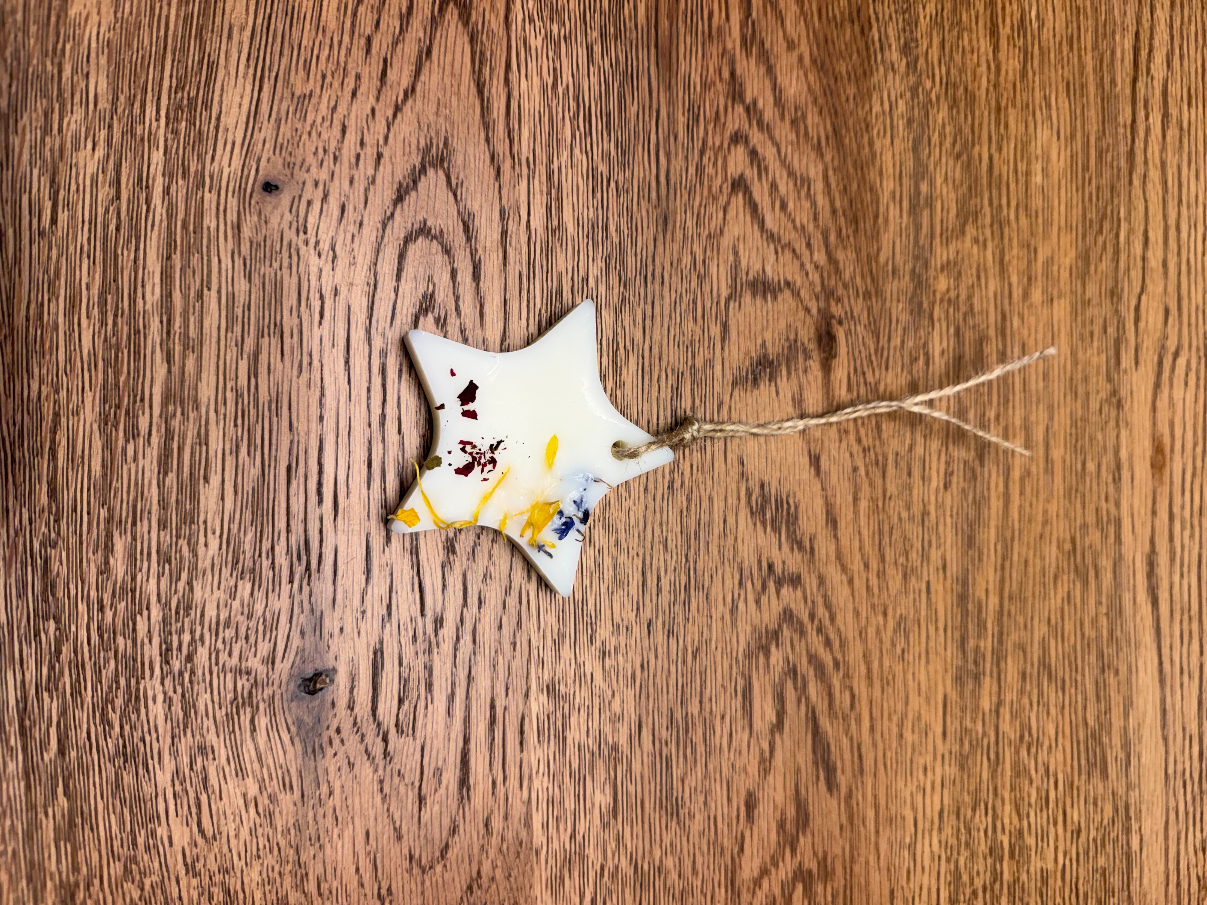 Cialda profumata in cera di soia vegetale, decorata con fiori e petali essiccati di fiordaliso, calendula e rosa.