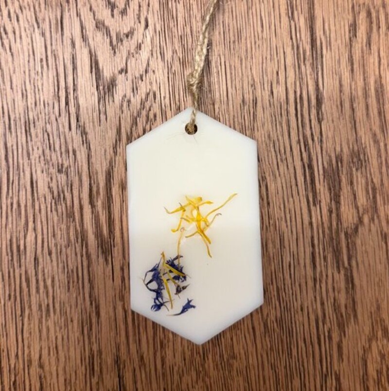 Cialda profumata in cera di soia vegetale, decorata con fiori e petali essiccati di fiordaliso, calendula e rosa.
